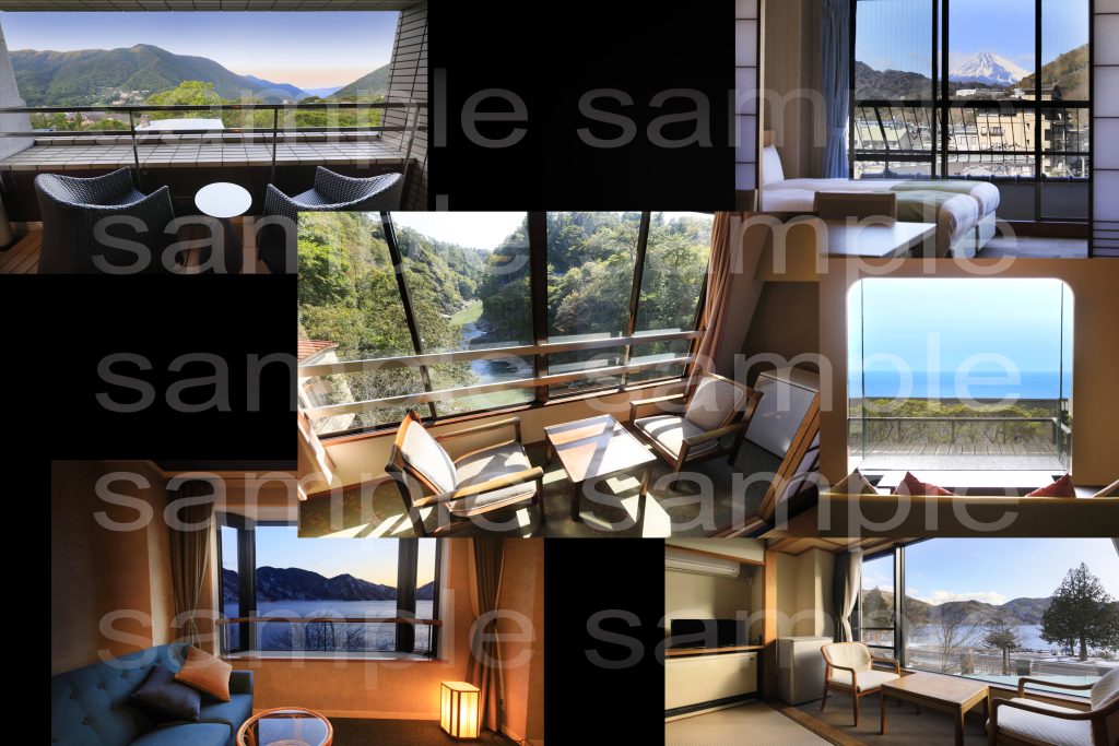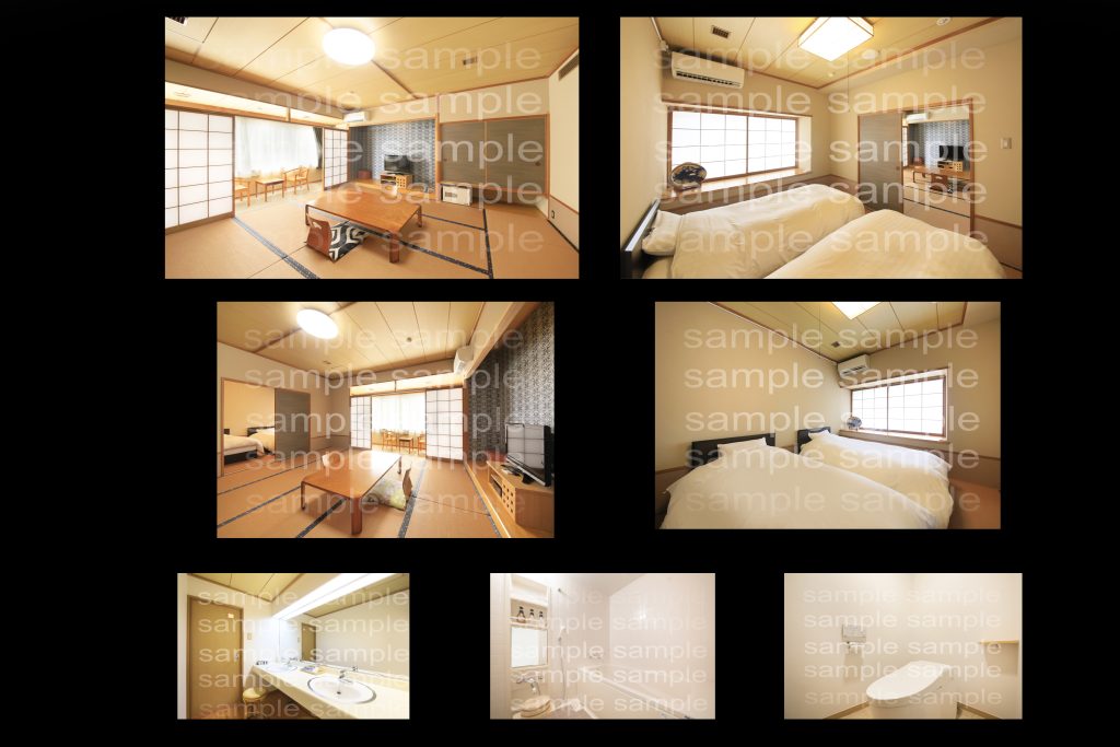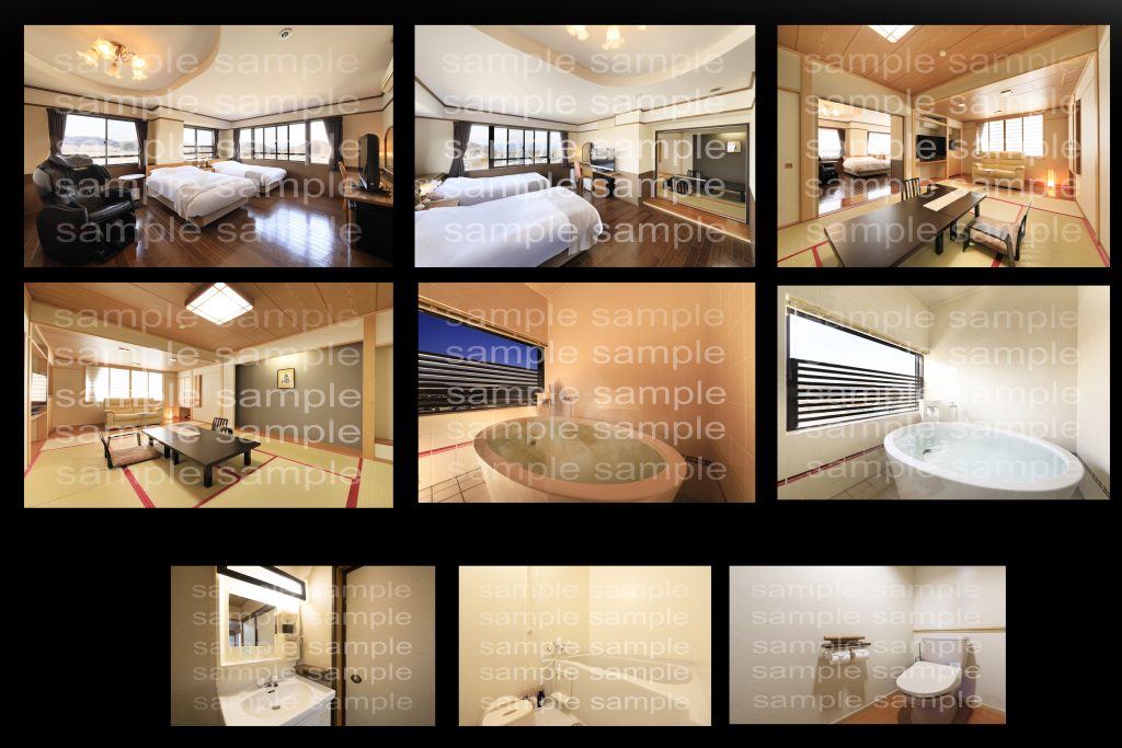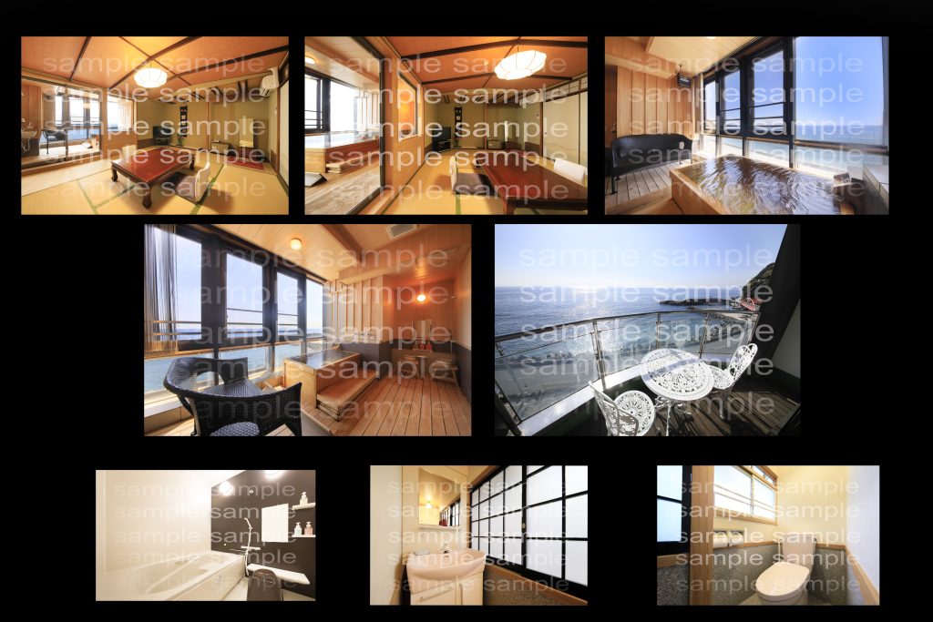 部屋全体2カット 露天風呂2カット 外の風景 水回り3カット 計8カット納品