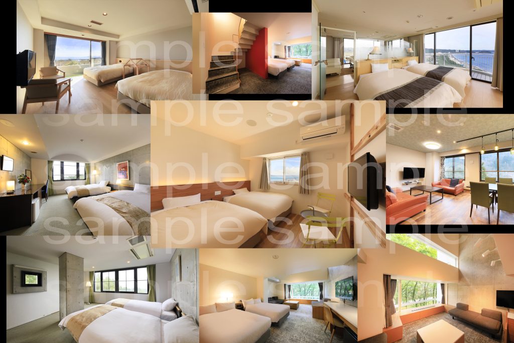 ベッドルーム、ベッドルームから和室、和室からベッドルーム、和室、露天風呂昼と夜、水回り3カット 計9カット納品